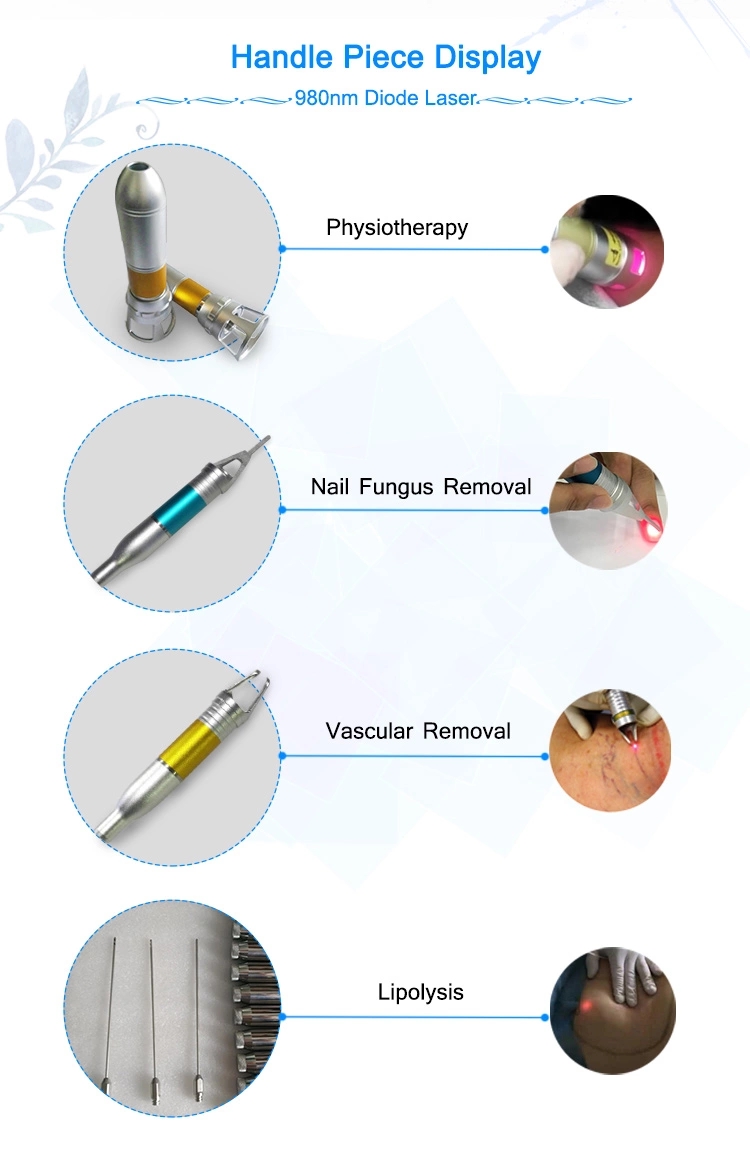 El láser de 980nm para la máquina de extirpación de la vena araña/vascular de 980nm es el espectro de absorción óptimo de las células vasculares de porfirina. Las células vasculares absorben el láser de alta energía de 980nm de longitud de onda, se produce la solidificación y finalmente se disipan. Úselo para curar el tratamiento con láser de venas, terapia de lesiones vasculares, venas de araña/venas faciales y eliminar vasos sanguíneos rojos: todo tipo de telangiectasia, hemangioma de cereza, etc.